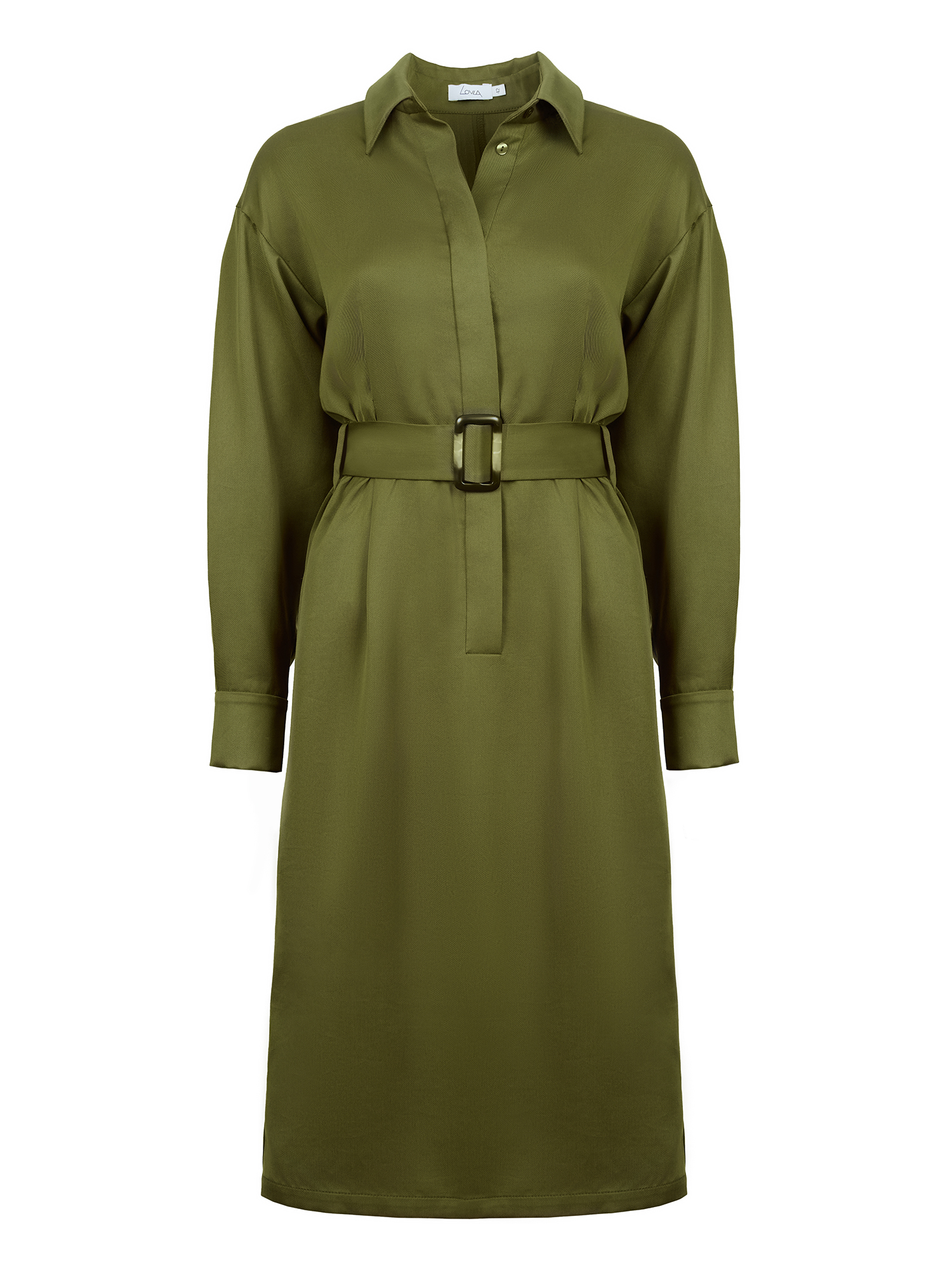 Платье-рубашка с супатной застежкой в комплекте с поясом, оснащенной роговой пряжкой.  Легкие намеки фиксированных складок помогают обуздать струящуюся драпировку у пояса и направляют складки на рукавах, а классические планки и шлица придают модели нотку строгости. В этом сочетании рождается элегантная сдержанность с изысканными деталями.