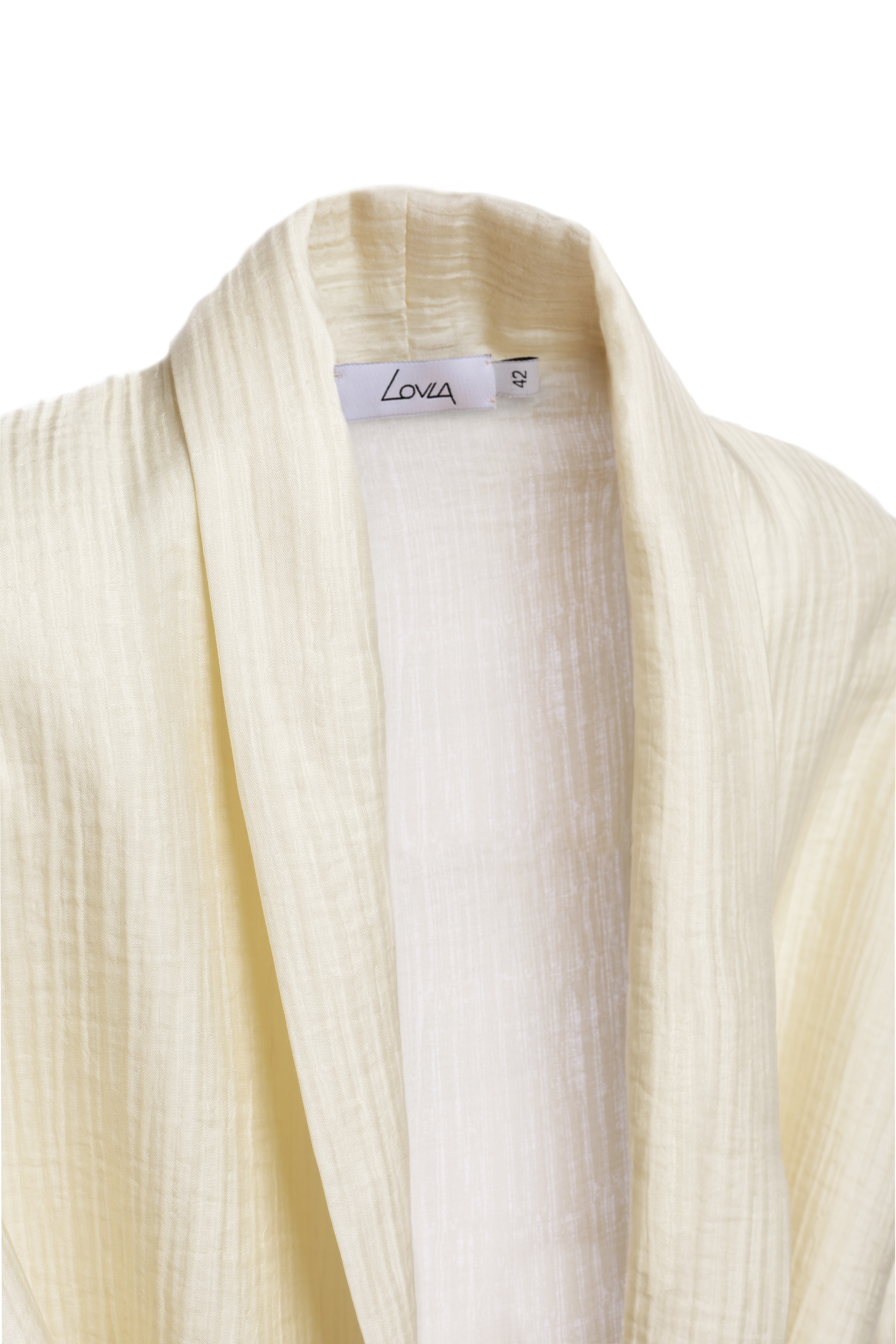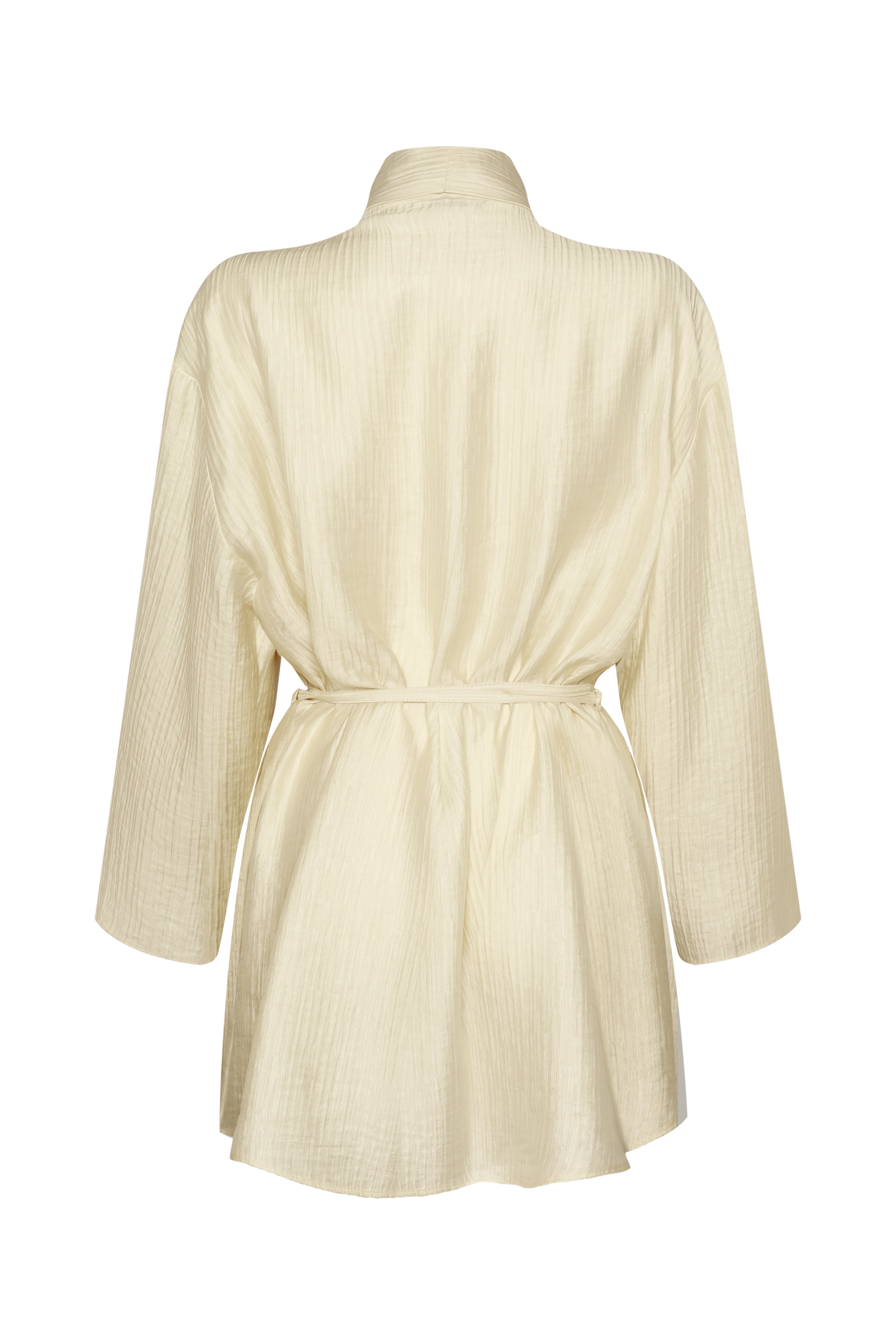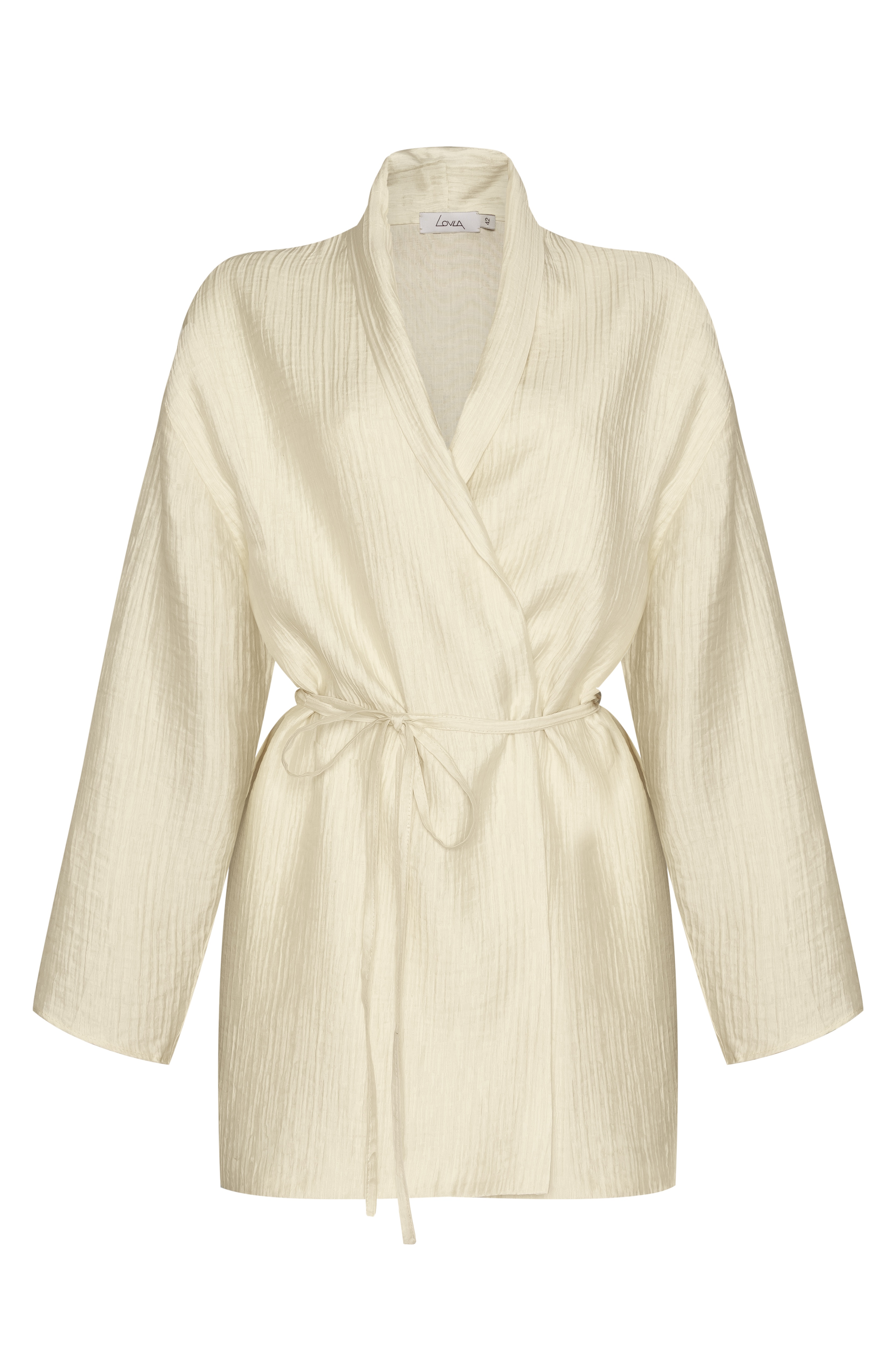 Воздушный и нежный молочный жакет-халат с благородным лоском, дополнен длинным тончайшим поясом. Выполнен из деликатной ткани с жатым крэш-эффектом.
